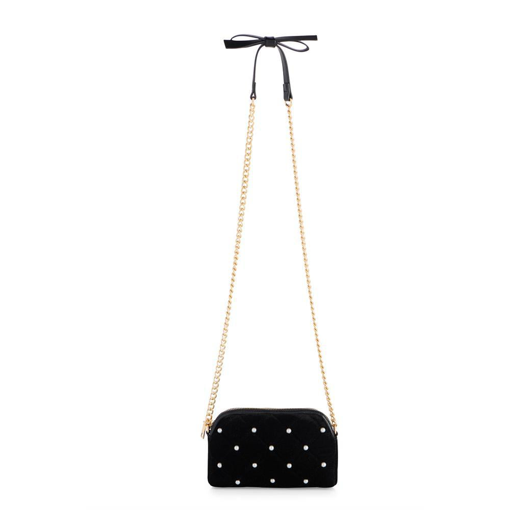 The Aimee Cross-Body is your new go-to glam piece for nights out and dressed-up days. Made with plush black velvet and topped with faux pearl accents, it’s the perfect mix of timeless and trendy. Featuring a sleek top zip closure, chic gold chain strap, and a handy inner slip pocket, this compact bag keeps your essentials close without sacrificing style. It’s just the right size for your phone, lipstick, and a little extra sparkle.