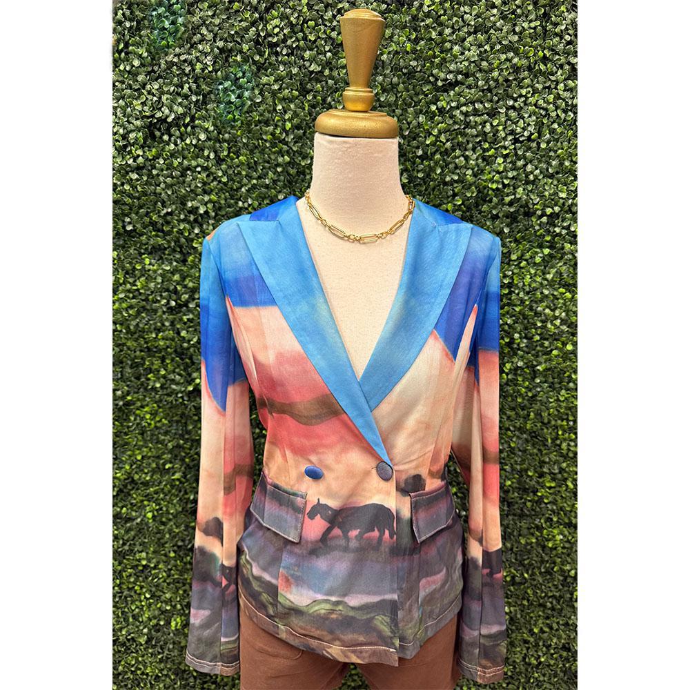 -Stretch: Good stretch -Texture: soft -Color: Blue Multi -Details: long sleeve, collared, mesh, horse print, blazer jacket -Neckline: collared -Sleeve Length: long sleeve -Fit Type: fitted