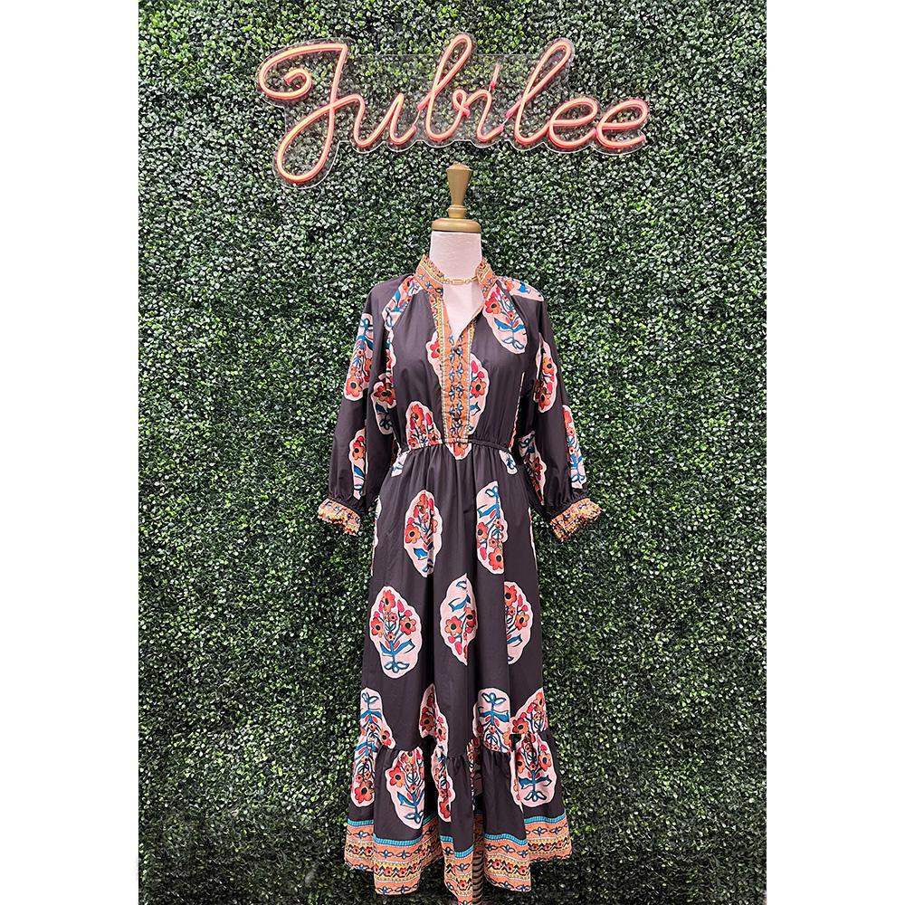 Ardeen Flower Patch Boarder Print V-Neck Midi Dress