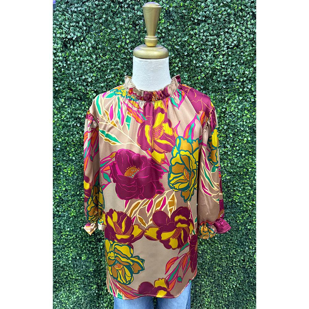 Floral print half sleeve mock neck top featuring ruffled detail at neckline and cuffs. Elasticized neckline and cuffs. Unlined. Woven. Non-sheer. Lightweight
