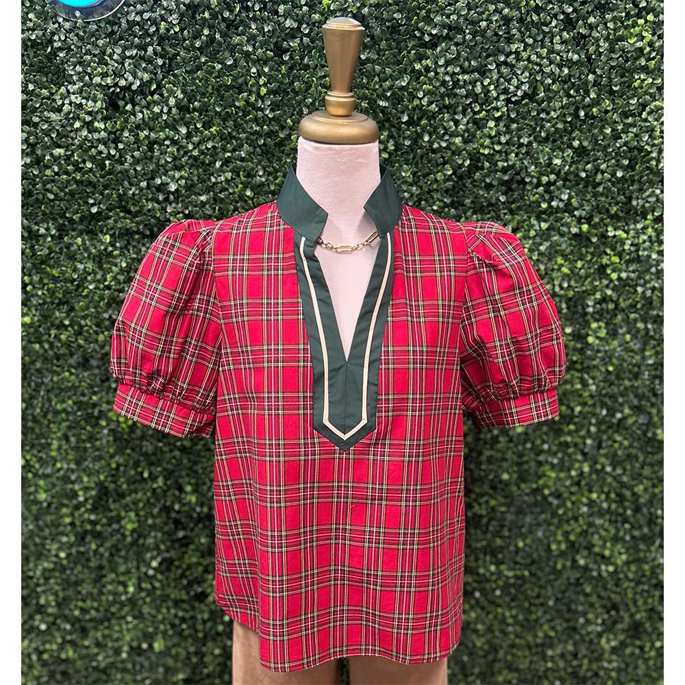Plaid pattern cuff band short sleeve top featuring contrast accent caftan-inspired V-neck band. Unlined. Woven. Non-sheer. Lightweight.