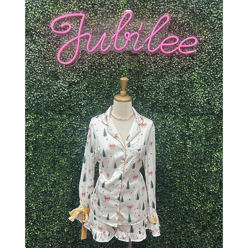 Pajama short set with tree and bow pattern. Velvet ribbon detailing.
