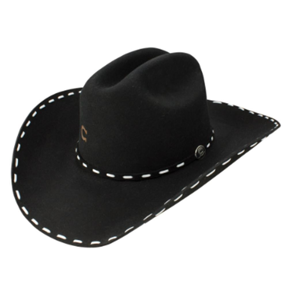 This cowboy hat by Charlie 1 Horse comes in a stone color that pairs well with just about anything. The brown leather buckstitching on the brim and hatband provides the perfect accent. It has a 4" brim, a 4 1/2" cattleman's crown, and leather sweatband.