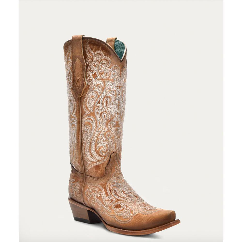 The fashionable 13-inch shaft camel color leather decorated with intricate white embroidery will go perfectly with your favorite sundress, denim, and wedding dress.