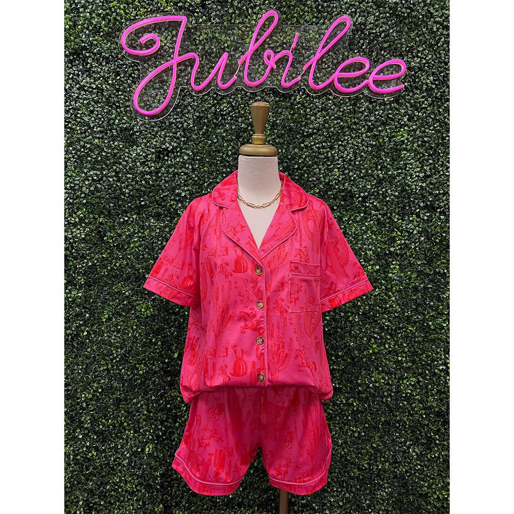 This set features a button-front shirt and a matching elastic-band short with pockets and button detail on the front.