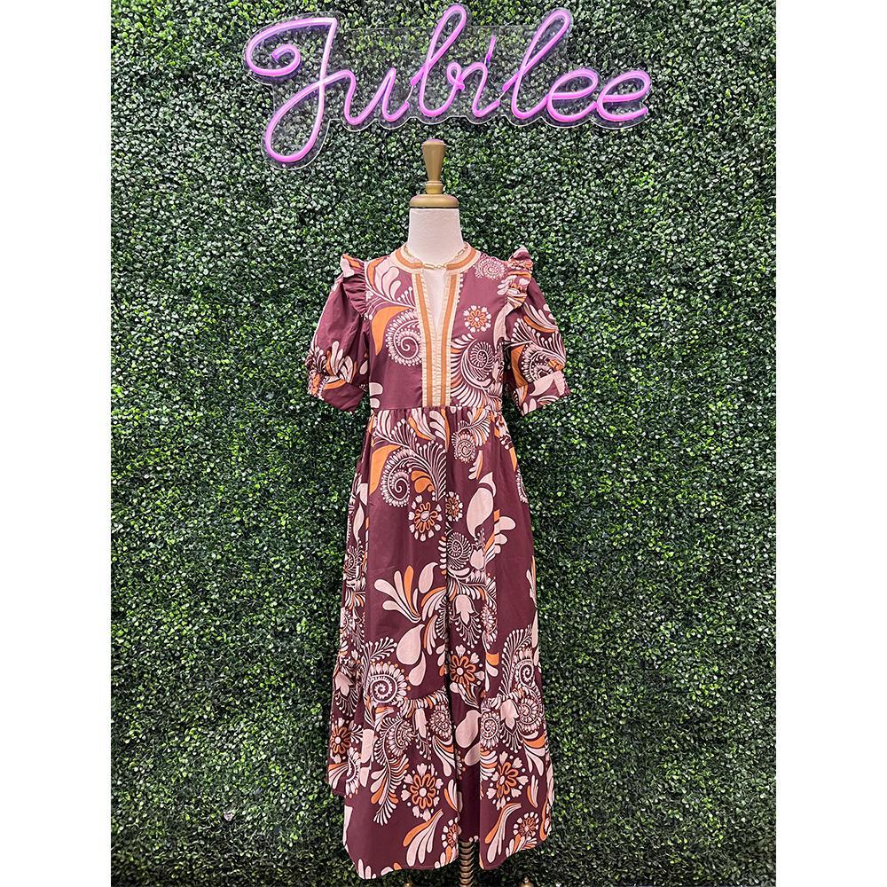 Calantha Brown Paisley Pattern Midi Dress