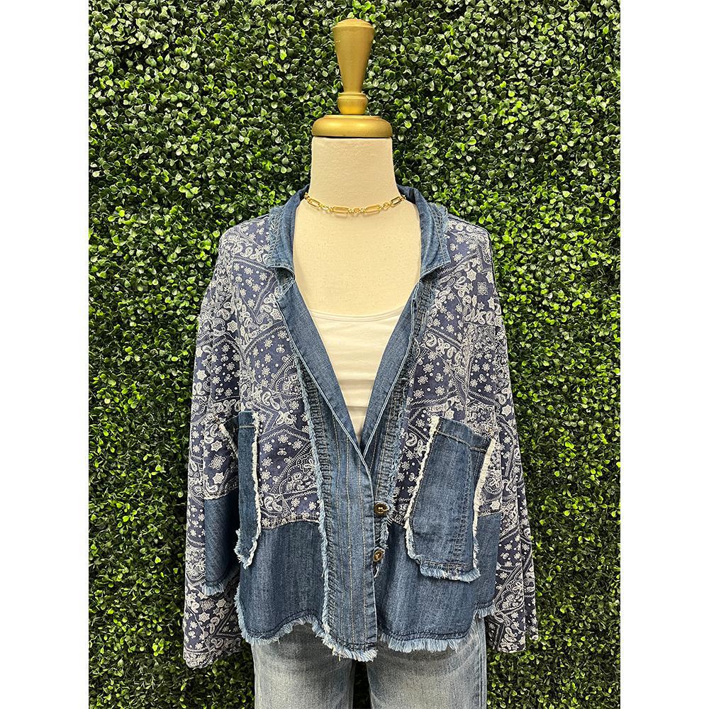 This long sleeve jacket showcases a bandana inspired patchwork print with contrasting denim paneling, oversized distressed patch pockets, an open front design with button closures, a structured V-neckline, wide sleeves, pleat detailing in the back, and a raw frayed hem, delivering a relaxed, bohemian aesthetic with vintage Western influences