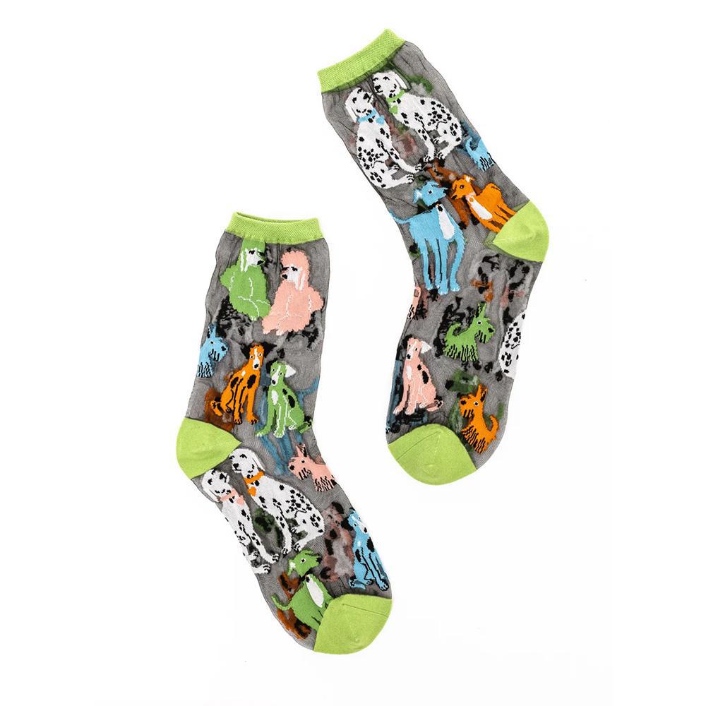 Our Dopamine Dogs black sheer sock is your go-to source for a daily dose of happiness. Bursting with personality, colorfully quirky pups in green, orange, pink, and white adorn the sock, making every step more fun. The fresh green cuff, heel, and toe add a playful Spring vibe, while the black sheer fabric keeps your look effortlessly chic.