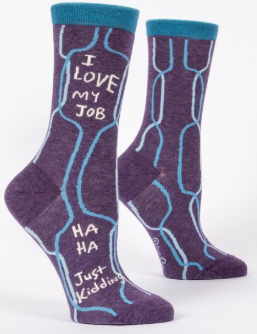 It's hard for me to relate to these socks because I love my job, for real. But I've definitely had jobs that I didn't love, and purple is my favorite, so I feel totally comfortable recommending them anyway. Women's shoe size 5-10.