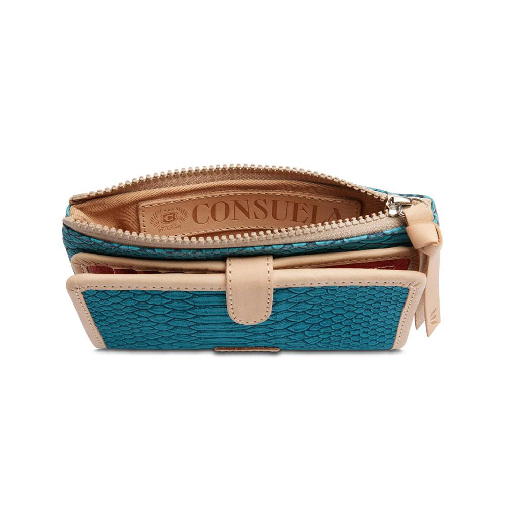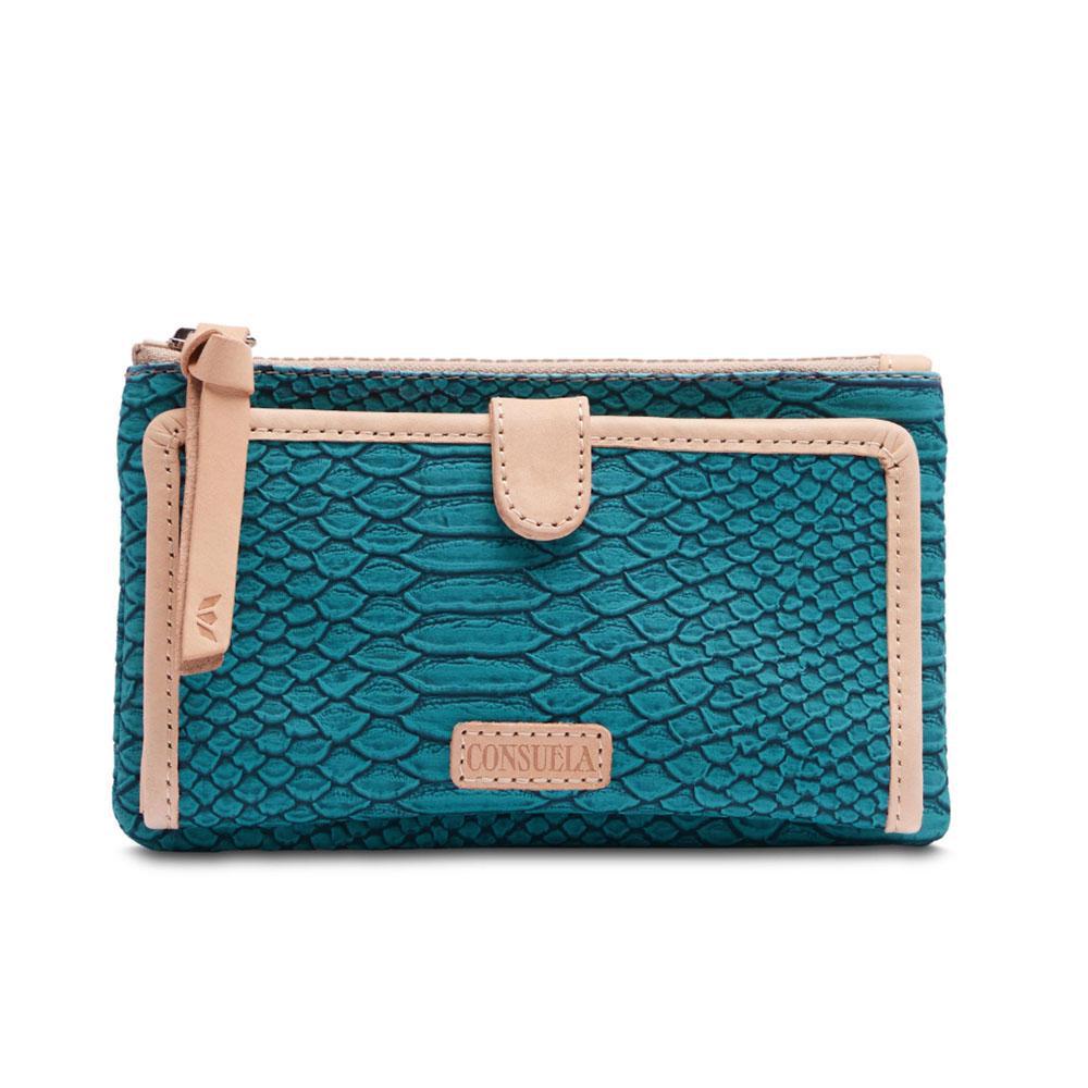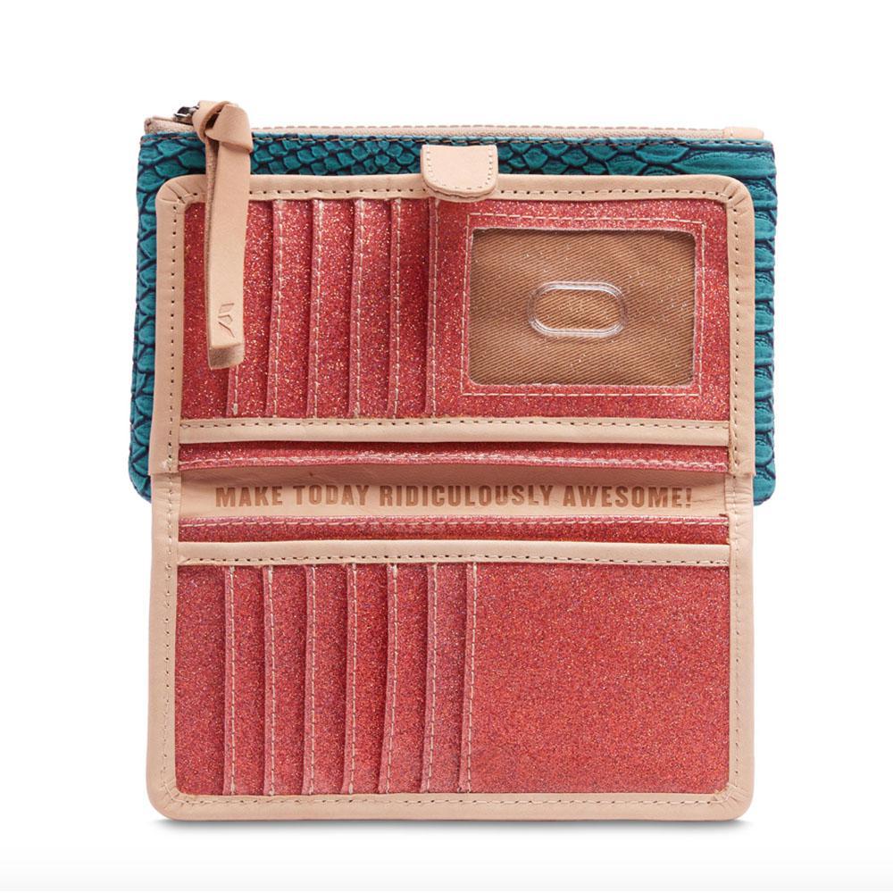 Our Slim Wallet carries cards and cash without weighing you down. Open the snap closure to reveal an ID window pocket, 12 card slots, and 4 slide pocket compartments in this versatile and colorful wallet.