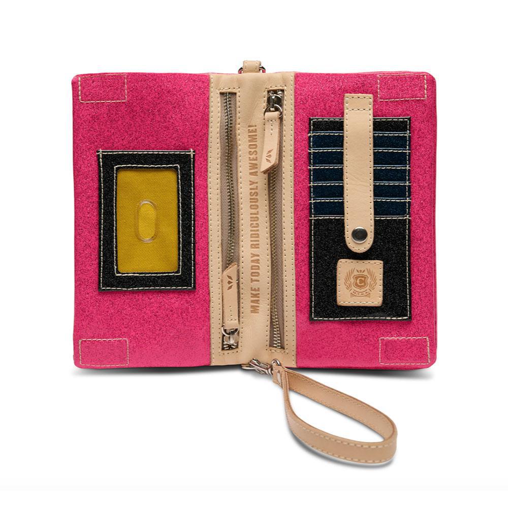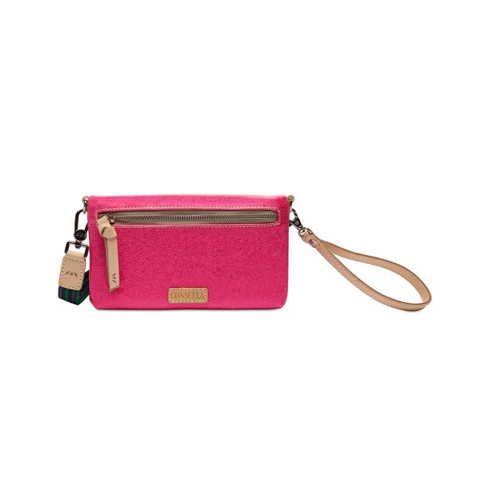 - Included detachable wristlet strap and adjustable woven crossbody strap