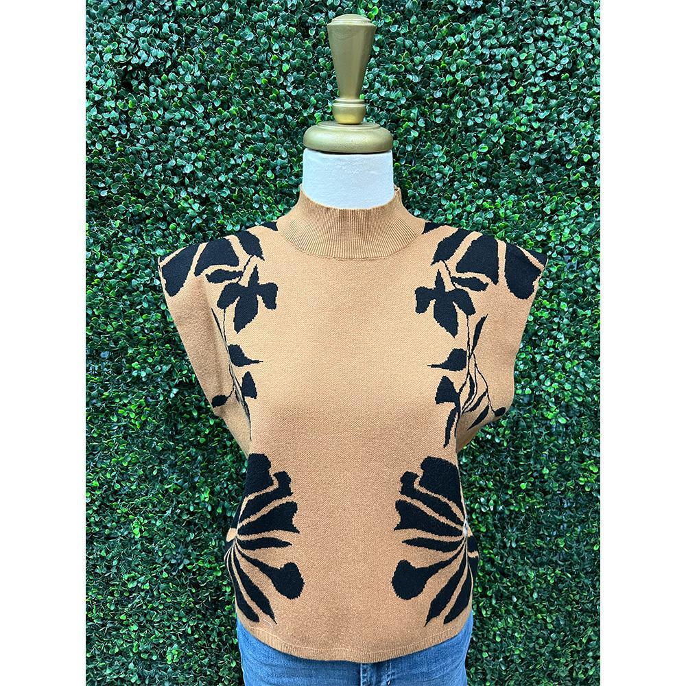Floral pattern high neck muscle sweater knit pullover top. Unlined. Knit. Non-sheer. Lightweight.