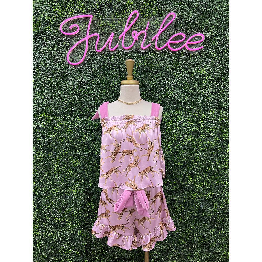 Treat yourself or a loved one to an elegant pajama set with the Lavender Leopard Tie Top Satin Pajama Set. Crafted from silk soft satin, it promises comfort & style with a tie top tank & drawstring waist ruffle shorts for a cozy night's sleep. With its eye-catching graphic print, high-quality fabric, & airy silhouette, this sleep set will make it hard not to want to stay in bed all day! Put some luxury into your downtime with the Lavender Leopard Tie Top Satin Sleep Set - you won't regret it!