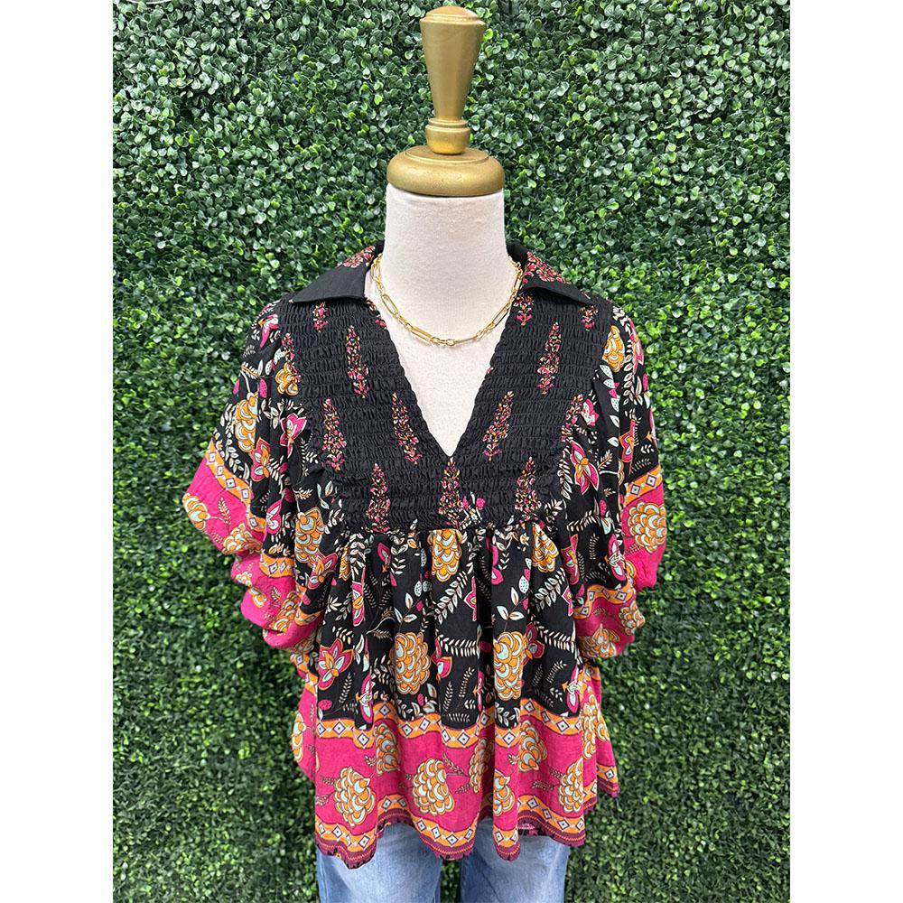 Botanical print short puff sleeve top featuring smocked yoke and collar V-neck. Unlined. Woven. Non-sheer. Lightweight.