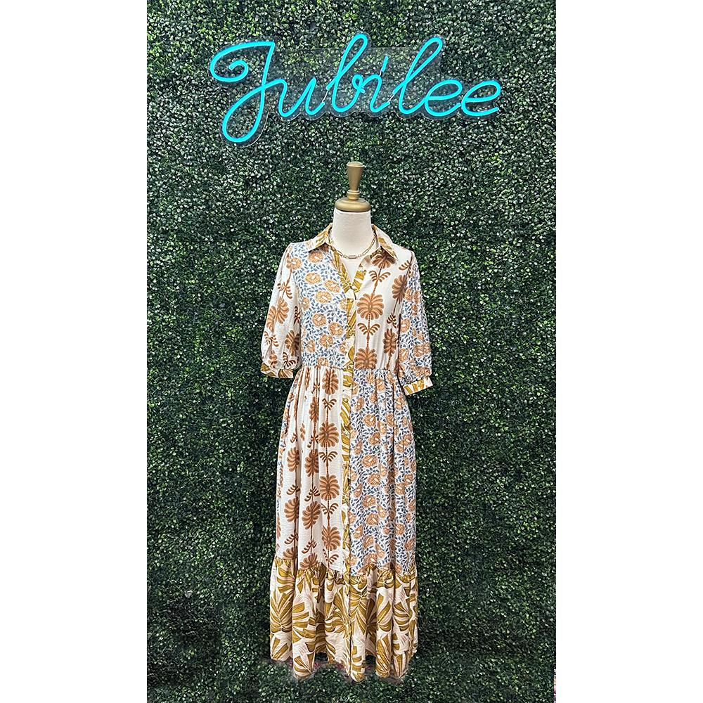 Mixed Print Shirt Dress with 1/2 Sleeves