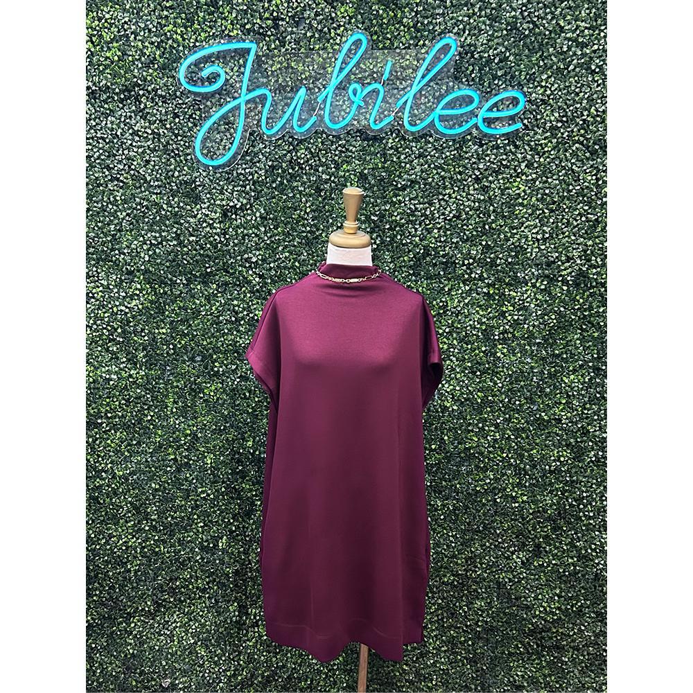 Solid jersey mock neck pullover mini dress. Side pockets. Unlined. Knit. Non-sheer. Lightweight.