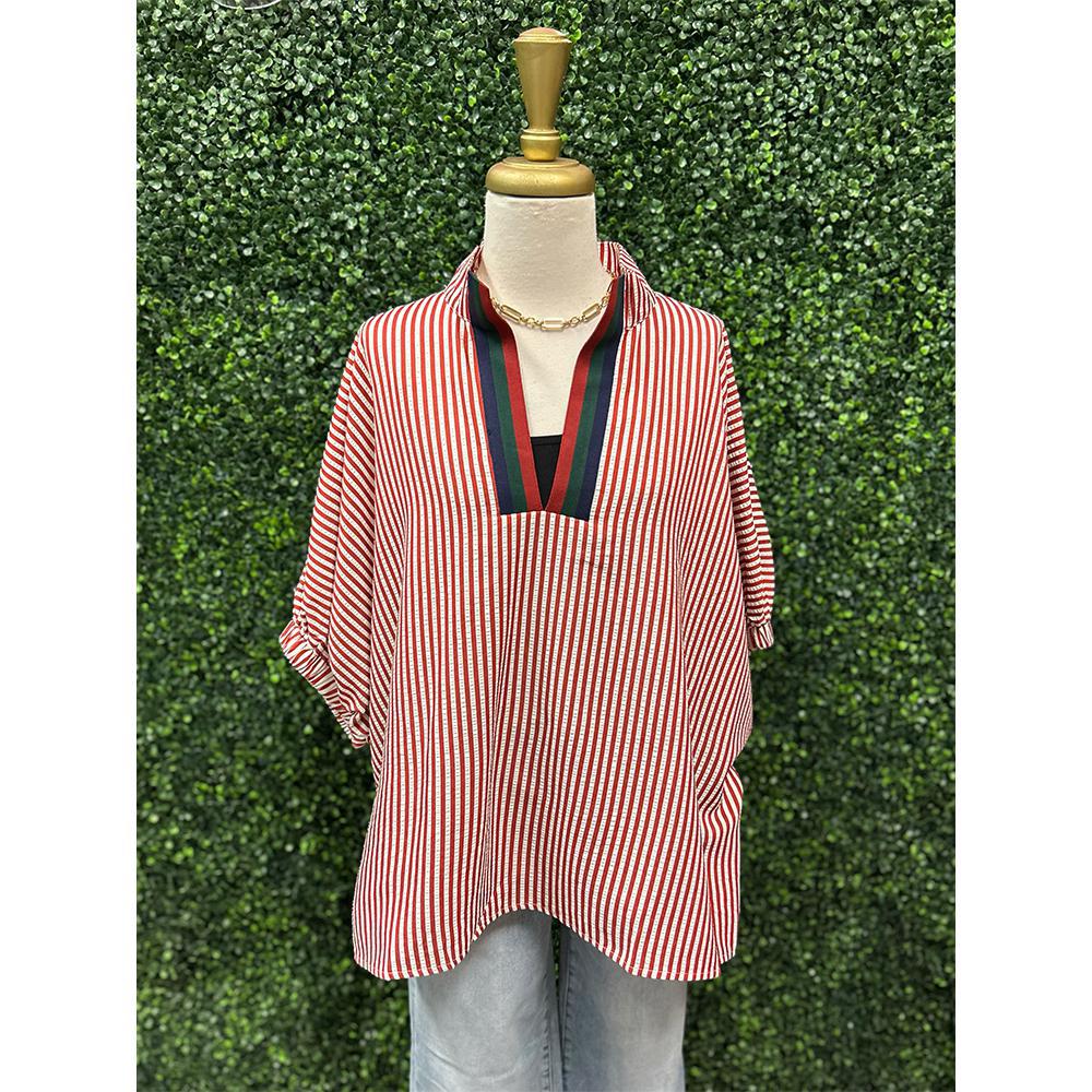 Stripe pattern high neck elasticated sleeve band dolman top featuring accented multicolor rib band split neck. Unlined. Woven. Non-sheer. Lightweight.