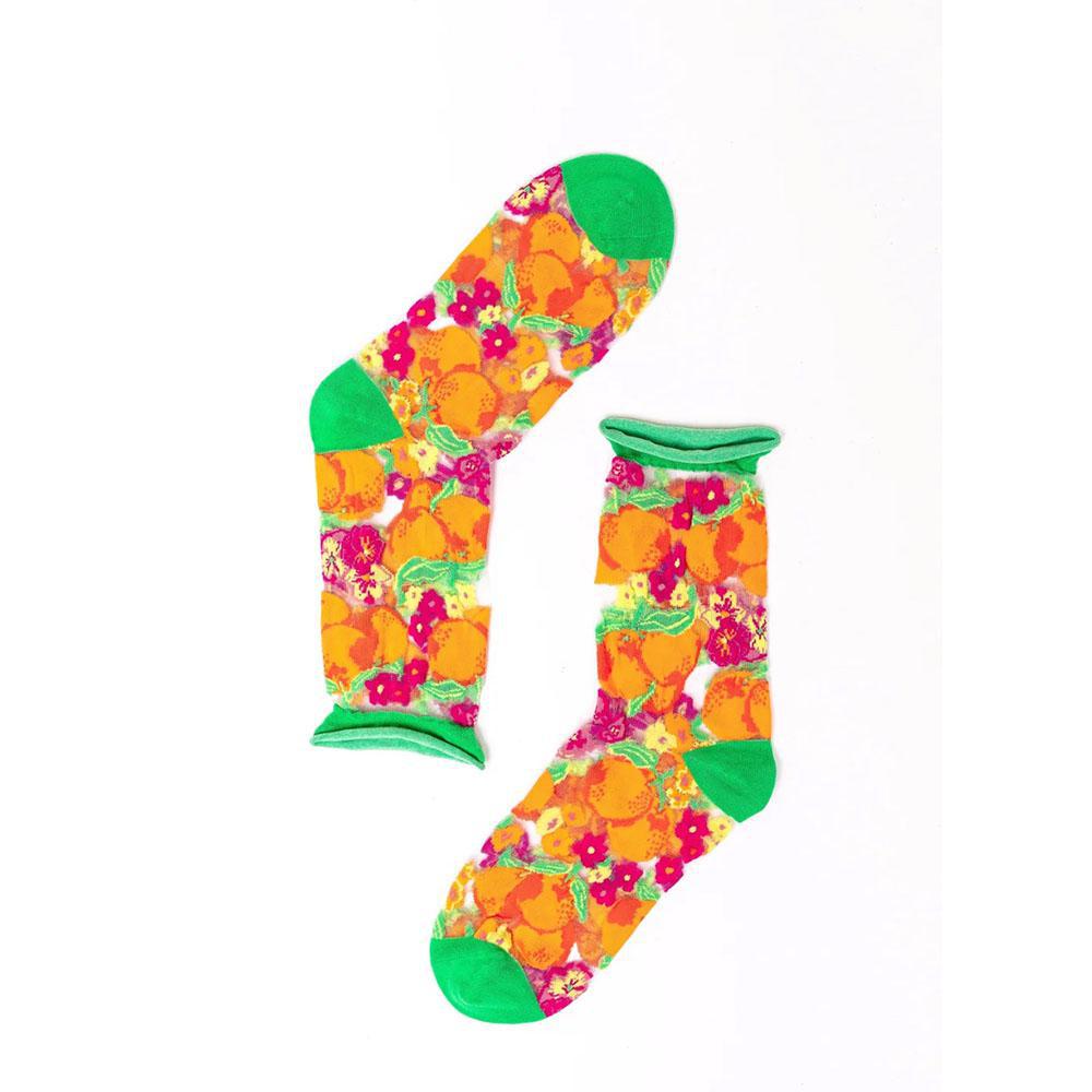 Juicy oranges paired with vibrant florals make our orange print sheer sock the essence of Spring and Summer. With a watercolor style illustration for an artsy effect, your feet will love the explosion of color and print. Finished with a green heel and cuff and a roll-top cuff for an effortless vibe.