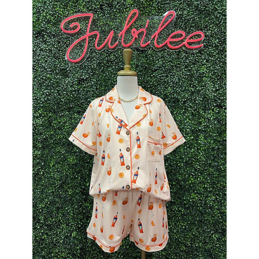 This set features a button-front shirt and a matching elastic-band short with pockets and button detail on the front.