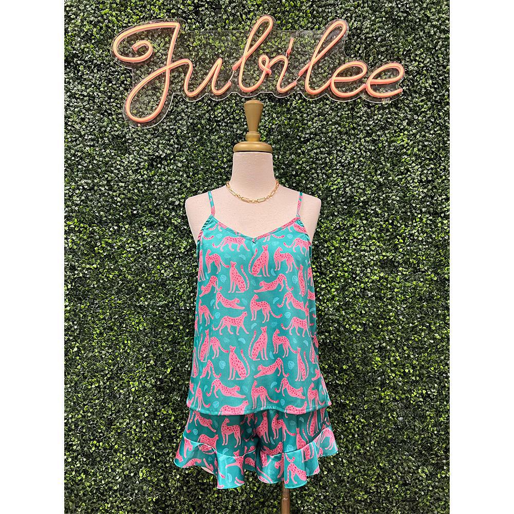 See ya, Cheetah Satin Pajama Tank Set, 97% Polyester, 3% Spandex