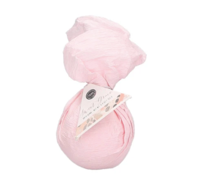 Bath bomb is 2.5" in diameter, shrink-wrapped, and packaged in lovely pink tissue paper.