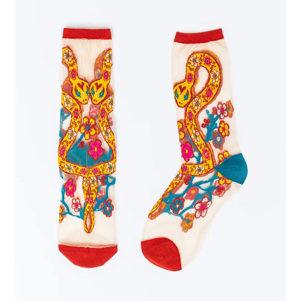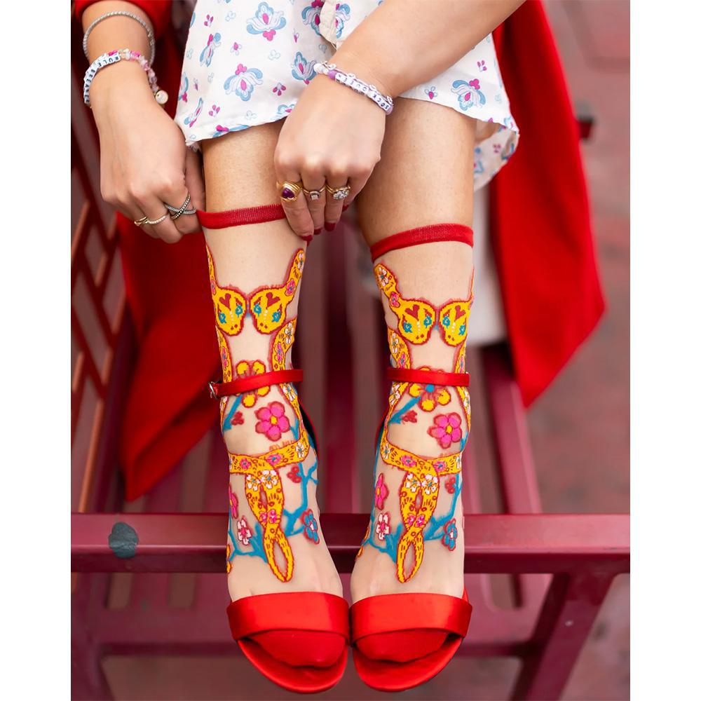 Celebrate Lunar New Year 2025 with our festive Year of the Snake sheer sock. Featuring two yellow snakes with floral patterns in red and turquoise, intertwined to form an abstract heart shape and surrounded by turquoise branches and larger flowers. This sock looks just as stunning from the side as it does from the front, making it an unforgettable showstopper. Pair with red heels for the perfect Lunar New Year look.
